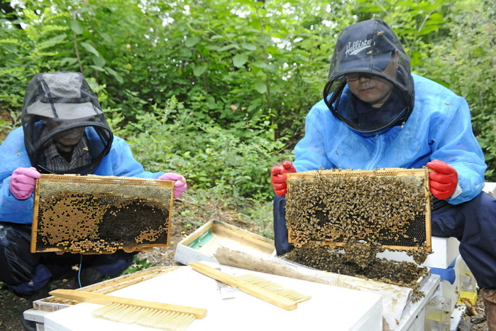 지난 27일 서울 광진구는 광장동 자투리 텃밭 뒤편에 위치한 도시양봉장에서 올해 첫 벌꿀 채밀 행사를 열었다. 사진은 관계자들이 벌꿀을 채밀하기 위해 소비(꿀통)를 들고 있는 모습.(사진제공=광진구청)