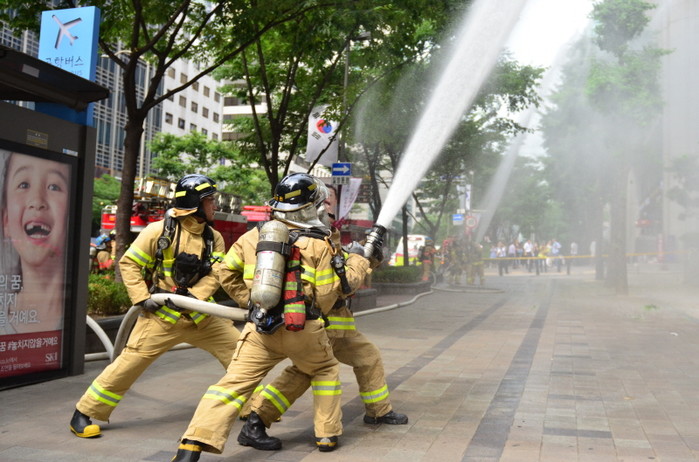 지난 27일 서울 강남소방서는 강남구에 위치한 삼성세무서에서 고층건물 화재진압훈련을 실시했다. 사진은 소방관들이 소방호스를 이용해 화재진압훈련을 하는 모습.(사진제공=강남소방서)