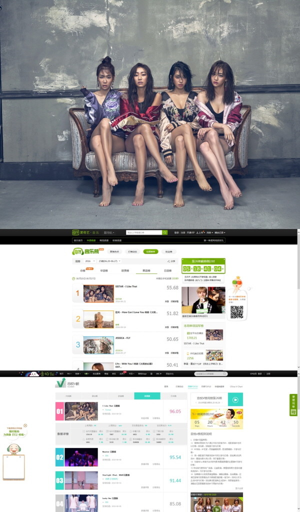 28일 중국 대표 음원사이트 QQ뮤직과 최대의 동영상 사이트 '인위에타이'에 따르면, 지난 21일 공개된 씨스타의 네 번째 미니앨범'沒我愛(몰아애)'의 타이틀곡 '아이 라이크 댓'뮤직비디오는 K팝 뮤직비디오 순위를 집계한 주간차트에서 1위에 올랐다.