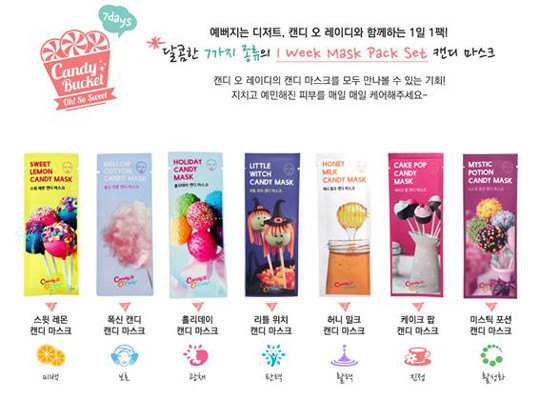1일1팩이라는 트렌드에 맞게 하루 하나씩 골라 쓸 수 있는 재미가 있는 ‘원 위크 캔디마스크팩’은 미백기능성 인증을 받은 ‘스윗레몬 캔디마스크’, 피부 보호에 특화된 ‘폭신코튼 캔디마스크’, 광채 나는 피부표현에 알맞은 ‘홀리데이 캔디마스크’, 피부 탄력에 도움을 주는 ‘리틀위치 캔디마스크’, 보호·피부 재생에 도움을 주는 ‘허니밀크 캔디마스크’, 피부 진정 효과 ‘케이크팝 캔디마스크’, 스트레스 요인을 제거해 피부 활성화에 도움을 주는 ‘미스틱포션’ 총 7종으로 구성돼 있다.