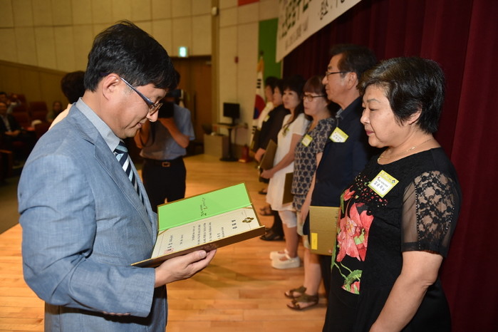 김성환 서울 노원구청장(왼쪽)이 지난 28일 오후 2시 노원구청 소강당에서 열린 '2016년 2분기 노원 모범구민 표창 시상식'에 참석해 표창장을 전달하고 있다.(사진제공=노원구청)