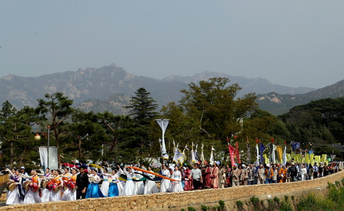 | 우리의 뛰어난 문화를 일본에 전하기위해 왕인박사가 떠나는 과정을 배우들과 11개 읍면민들이 함께 뮤지컬로 표현한 영암왕인문화축제의 대표 프로그램‘왕인박사 일본가오’ 퍼레이드의 한 장면. | ||