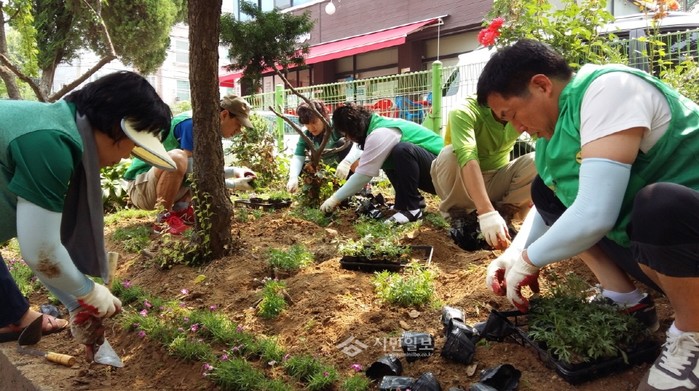 지난 28일 경기 안산시 부곡동은 새마을지도자 회원을 비롯해 직능단체원 40여명이 참석한 가운데 지역내 부곡경로당, 시랑경로당에 구절초·잔디패랭이 8000본을 심어 야생화 화단을 조성했다. 사진은 관계자들이 화단을 꾸미고 있는 모습.(사진제공=안산시청)