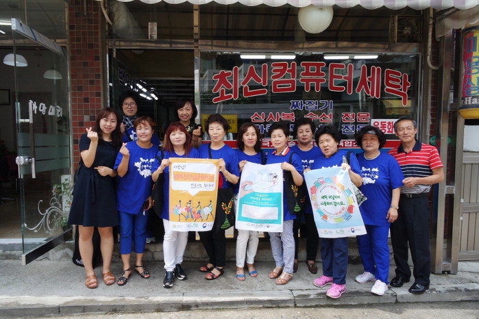 지난 29일 서울 금천구 독산2동 주민센터는 (사)자원순환사회연대와 함께 '1회용 옷걸이 재사용과 세탁비닐커버 안쓰기'를 실천하는 세탁소 12곳에 자원순환세탁소 현판을 수여했다. 사진은 관계자들이 기념촬영을 하는 모습.(사진제공=금천구청)