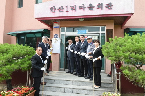 최근 경기 양주시는 남면 한산1리 마을회관에서 시민의 자살예방관리를 위한 협력 체계를 구축하고자 ‘생명사랑 녹색마을 협약 및 현판식’을 개최했다. 사진은 이성호 시장(오른쪽에서 다섯번째)과 관계자들이 현판식을 거행하는 모습.(사진제공=양주시청)