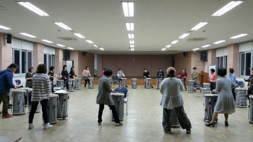 최근 경북 구미시 해평면에서는 복지회관에서 강사 및 수강생 등 30여 명이 참석한 가운데 2016년 상반기 읍ㆍ면ㆍ동 맞춤형교육 '모듬북교실 종강파티' 행사를 가졌다. 사진은 관계자들이 모듬북 퍼포먼스를 선보이는 모습.(사진제공=구미시청)