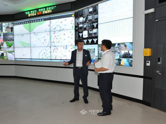 최근 경기 동두천시로부터 '동두천시 1일 명예시장'으로 위촉된 박종규씨(왼쪽)가 '동두천시 폐쇄회로(CC)TV 관제센터'를 찾아 관계자와 의견을 나누고 있다.(사진제공=동두천시청)
