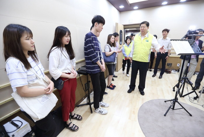 조길형 영등포구청장(오른쪽)이 최근 구청 아르바이트 대학생들과 함께 유스스퀘어를 찾아 시설에 관한 설명을 하고 있다.(사진제공=영등포구청)