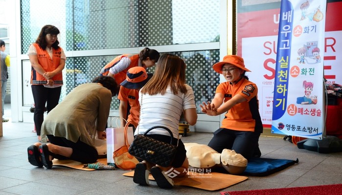 지난 4일 서울 영등포소방서는 영등포역 앞에서 롯데백화점 및 영등포역 등을 찾은 이용객을 대상으로 여름 피서철을 맞이해 물놀이 등의 안전사고 예방을 위한 '찾아가는 안전체험장'을 운영했다. 사진은 소방대원들이 심폐소생술 체험을 실시하는 모습.(사진제공=영등포소방서)