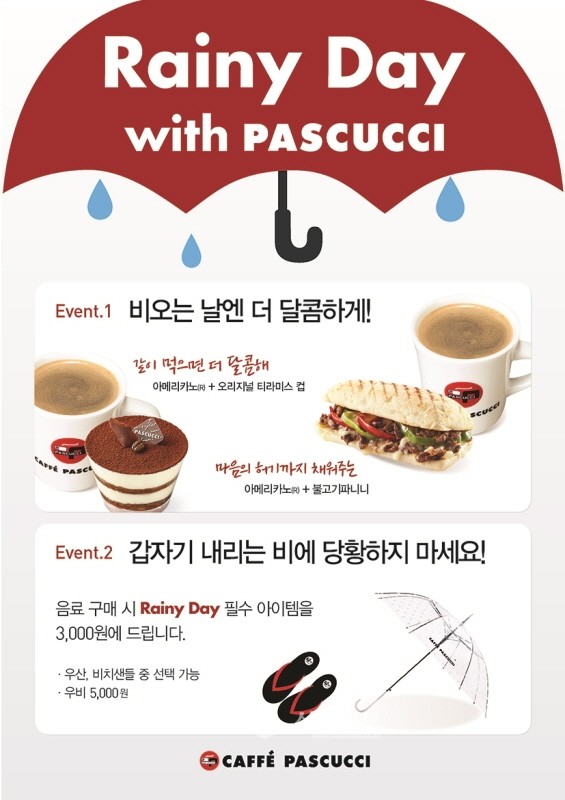 파스쿠찌 관계자는 “비 오는 날에는 감상적인 기분으로 아늑한 카페를 찾는 사람들이 늘고 케이크류나 베이커리 등 사이드메뉴를 찾는 고객 비중이 평소보다 높아진다는 점에 착안해 비 오는 날 다양한 혜택을 제공하는 프로모션을 준비했다”며 “앞으로도 고객의 편의와 만족도를 높일 수 있는 다양한 맞춤형 마케팅을 펼칠 예정”이라고 전했다.