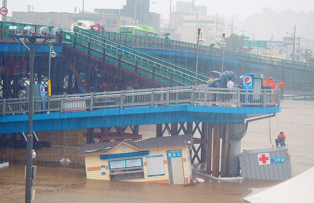5일 오전 서울 중랑구 중랑천 장안교 밑에서 소방관들이 폭우로 인해 물에 떠내려가는 가건물을 교각 부근에 고정시키고 있다.
