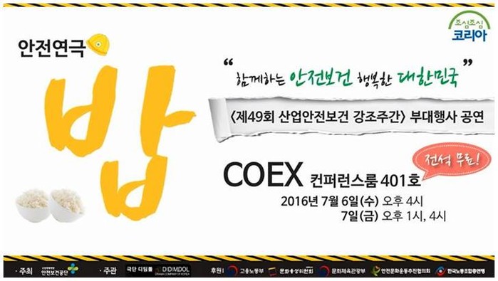 한편, 안전 음악연극 ‘밥’은 2016년 제49회 산업안전보건강조주간 특별 행사로 진행되며, 선착순 사전 예약자에 한해 관람이 가능하다. 7월 6일(수) 4시, 7월 7일(목) 1시, 4시 총 3회 공연된다.