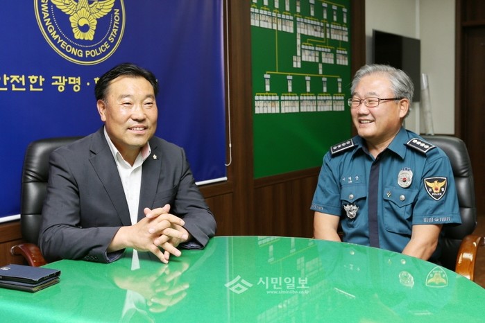 지난 5일 이병주 경기 광명시의장은 후반기 의장 선출 이후 첫 일정으로 광명경찰서를 찾아 시민 치안문제 등을 논의했다. 사진은 경찰서를 방문한 이병주 의장(왼쪽)이 이명균 경찰서장과 이야기를 나누는 모습. (사진제공=류만옥 기자)