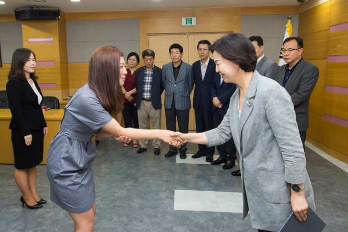 김수영 양천구청장(오른쪽)이 최근 구청 공감기획실에서 열린 사회복지 새내기 공무원 임용식에 참석해 임용장을 전달하고 악수를 하고 있다.(사진제공=양천구청)