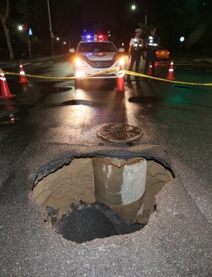 최근 싱크홀과 지반 침하 현상이 잇따랐던 서울 송파구 제2롯데월드 주변에서 지반침하 현상이 또 발생했다. 5일 서울 송파구 신천동 파크리오아파트 사거리 중심 도로에서 지름 1m 크기의 원모양 구멍이 생겼다. 6일 새벽 경찰이 구멍 근처에 폴리스 라인을 설치해두고 있다.