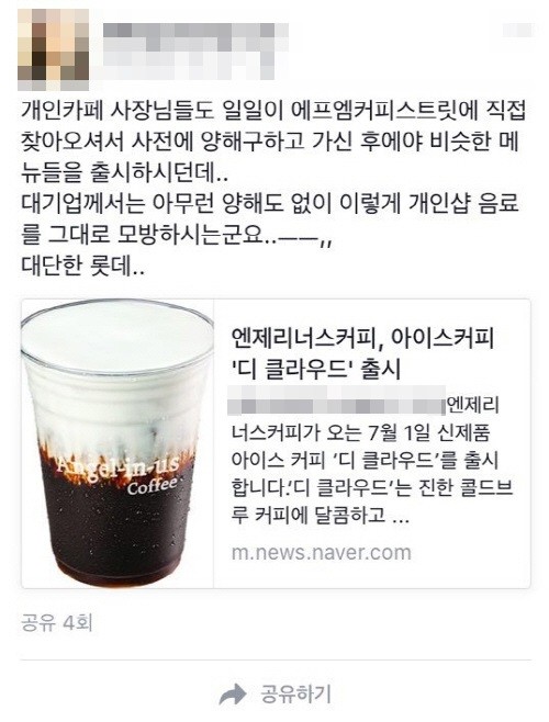 논란이 된 제품은 엔제리너스가 지난 1일 출시한 '디 클라우드'로, 누리꾼들은 부산 서면의 'FM커피스트릿'의 '투모로우'라는 메뉴와 유사하다고 주장했다.