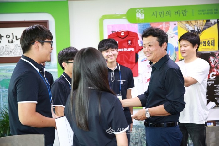 지난 6일 김만수 경기 부천시장은 '공무원 진로멘토링 프로그램'의 일환으로 지역내 계남고등학교의 5명의 학생을 초대해 진로상담을 실시했다. 사진은 김만수 시장(가운데)이 청소년들의 질문에 답하는 모습.(사진제공=부천시청)