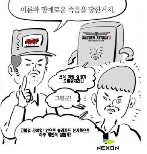 | ▲ 이말년 웹툰을 이용해 서든어택2와 넥슨을 풍자한 패러디물/사진출처=온라인 커뮤니티 | ||