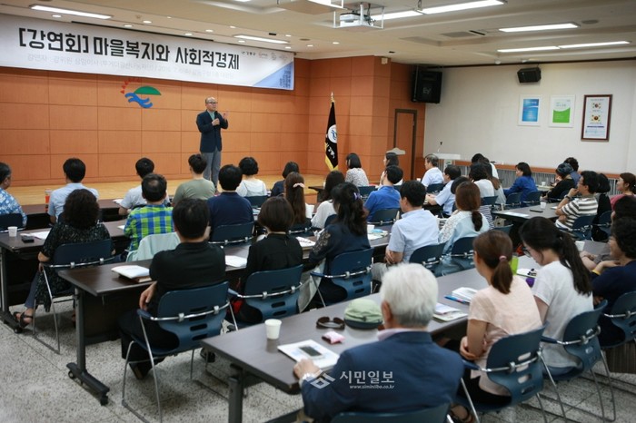 지난 6일 서울 강동구는 사회적경제주간을 맞아 구청 5층 대강당에서 지역내 복지시설 근무자와 구·동 마을복지 담당 직원 등을 대상으로 '마을복지와 사회적경제'를 주제로 대중강연회를 개최했다. 사진은 강연이 진행되고 있는 모습.(사진제공=강동구청)