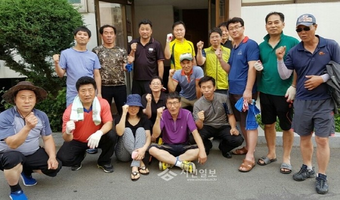 경기 군포시의회 주연규 의원과 군포시자율방범연합대원 16명이 최근 금정동과 산본1동 저소득층 가정 2곳을 찾아 벽지, 장판을 교체해주고 내부청소를 하는 등 봉사활동을 펼치고 기념촬영 하고있다.(사진제공=군포시의회)