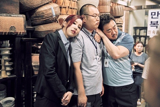 공개된 사진에서는 고규필을 사이에 두고 왼쪽에는 마동석이, 오른쪽에는 김주리가 그의 어깨에 기대 괜스레 뾰로통하거나 울상을 짓는 표정으로 장난을 치며 화기애애한 현장 분위기를 엿볼 수 있게 했다.