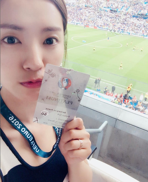 사진 속 정인영은 유로2016 경기장을 배경으로, 프리미엄 티켓을 들고서 포즈를 취하고 있다. 평소 축구를 좋아하기로 알려진 그의 표정에서 행복함이 느껴진다.
