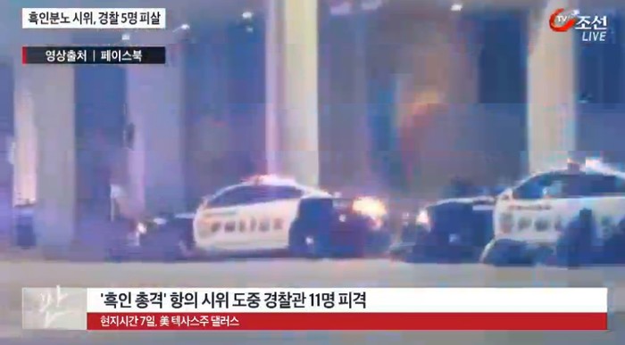 현지시간 7일 밤 미국 댈러스에서 저격범들이 경찰을 조준해 발사한 총에 경관 11명이 맞아 이중 5명이 숨졌다. 당시 거리에는 '흑인 총격 사건' 항의 시위가 한창이었다.