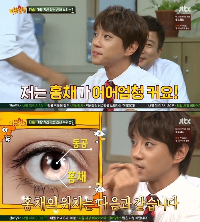 이날 함께 출연한 씨스타가 먼저 자신들의 장점을 공개했고, 이어 그 또한 "나도 자랑할 게 있다"며 "과학적으로 검증이 됐다. 홍채가 엄청 크다"고 자랑했다.