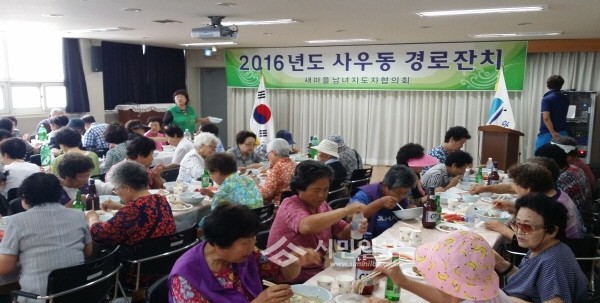 지난 7일 김포시 사우동 새마을남녀지도자회는 동주민센터 2층 다목적홀에서 지역내 홀몸노인 150여명을 대상으로 삼계탕과 다과를 대접하는 경로잔치를 열었다. 사진은 노인들이 식사하고 있는 모습.(사진제공=김포시청)