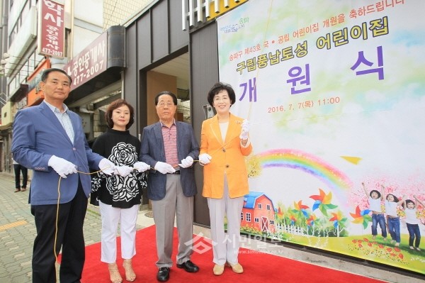 박춘희 서울 송파구청장(오른쪽)이 최근 풍납동 문화재 보존지구에 위치한 43번째 구립어린이집 ‘풍납토성 어린이집’ 개원식에 참석해 참여 내빈들과 기념촬영 하고 있다.(사진제공=송파구청)