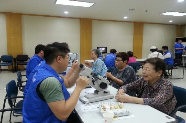 동대문구가 최근 지역내 다비치안경과의 결연사업의 일환으로 시력 저하로 어려움을 겪는 노인들을 위한 '어르신 무료 안경맞춤 행사'를 진행한 가운데 노인들이 시력검사를 받고 있다.(사진제공=동대문구청)