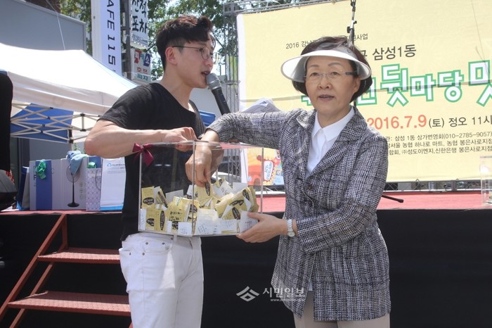최근 서울 강남구 삼성1동에서 침체된 골목 상권을 활성화시키기 위해 상가번영회 주최로 '(구)한전 뒷마당 맛거리 축제'가 열렸다. 사진은 행사에 참석한 신연희 구청장(오른쪽)이 경품 추첨을 하고 있는 모습.(사진제공=강남구청)