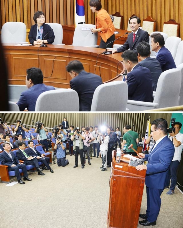 더불어민주당 우상호 원내대표가 12일 오전 국회에서 열린 비공개 의원간담회를 주재하고 있다(위). 국민의당 박지원 비상대책위원장이 12일 오전 국회에서 열린 의원총회에서 의사봉을 두드리고 있다.