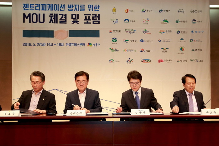 | 지난 5월 한국 프레스센터에서 '젠트리피케이션 방지를 위한 MOU 체결 및 포럼'이 개최됐다. 사진은 왼쪽부터 김영종, 유덕열, 정원오, 이성 구청장의 모습. |