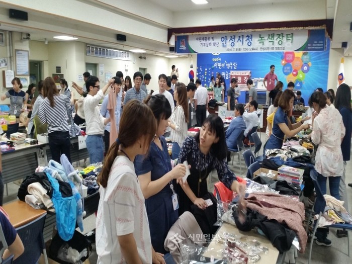최근 경기 안성시는 자원재활용 및 기부문화 확산을 위한 '안성시청 나눔의 녹색장터'를 시청 4층 대회의실에서 개최했다. 사진은 장터에 참가한 직원들이 물품을 살펴보고 있는 모습.(사진제공=안성시청)