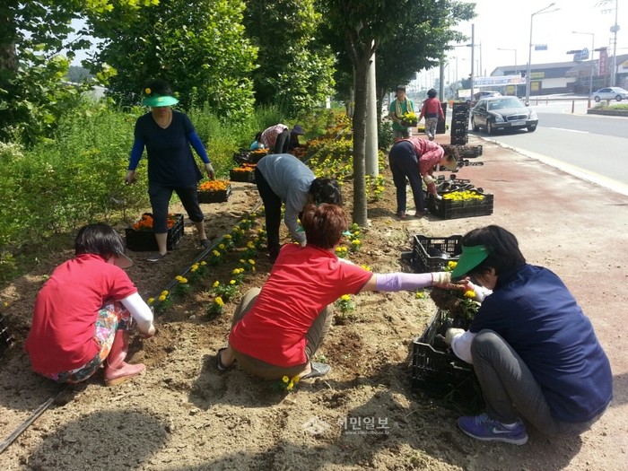 최근 경기 이천시 호법면 새마을지도자협의회는 괘적한 마을환경조성 사업의 일환으로 도로변 잡목 및 잡초 제거와 아름다운 꽃길 조성을 실시했다. 사진은 협의회원들이 도로변에 꽃을 식재하고 있는 모습.(사진제공=이천시청)
