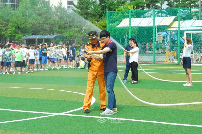 13일 경기 하남소방서는 나룰초등학교에서 학생 및 교직원을 대상으로 공공기관 합동소방훈련을 실시했다. 사진은 학생들이 소방호스 사용 방법에 대해 배우는 모습.(사진제공=하남소방서)