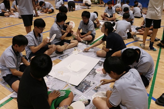 지난 12일 충남 아산시 신창중학교는 학기말 꿈끼 주간을 활용해 인성부채를 제작했다. 사진은 교내 신창관에서 학생들이 열심히 부채를 만드는 모습.(사진제공=아산교육지원청)