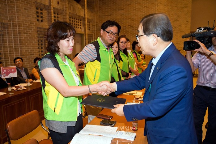 지난 12일 경북 구미시는 시청 4층 대강당에서 시민들의 불편사항을 발굴하고 개선 요구사항을 시에 전달하는 '제3기 시민행복추진단'의 위촉식을 개최했다. 사진은 남유진 시장(오른쪽)이 행복단원에게 위촉장을 수여하는 모습.(사진제공=구미시청)