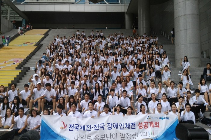 지난 13일 충남 아산시는 서울 용산역에서 오는 10월 시에서 개최되는 전국체전 및 전국장애인체전의 전국적인 홍보를 위한 '2016 전국체전·전국장애인체전 내일로 홍보단 발대식'을 개최했다. 사진은 홍보단원들이 기념촬영하는 모습.(사진제공=아산시청)