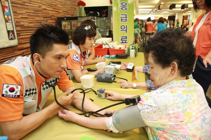 지난 12일 구로소방서 직원 및 의용소방대원 40여명은 독산동 소재 메이퀸웨딩홀 2층에서 열린 ‘금천어르신을 위한 효잔치’ 행사장을 찾아 자원봉사활동을 진행했다. 사진은 소방관이 노인의 혈압을 측정하는 모습.(사진제공=구로소방서)