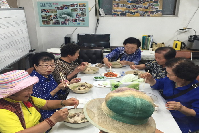 지난 13일 도봉구 쌍문1동 자원봉사캠프는 다문화 여성들과 함께 동주민센터에서 초복을 맞아 홀몸노인들을 위한 보양 삼계탕 나눔 행사를 개최했다. 사진은 노인들이 삼계탕 식사를 하고 있는 모습.(사진제공=도봉구청)