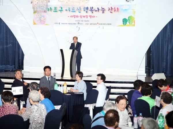 지난 14일 박홍섭 서울 마포구청장은 대한적십자사 봉사회 마포구지구협의회가 주관해 도화동 소재 이룸 웨딩컨벤션에서 지역내 소외계층 노인 160명을 초청해 열린 '어르신 행복나눔 잔치'에 참석했다. 사진은 박 구청장이 인사말을 하고 있는 모습.(사진제공=마포구청)