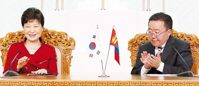 박근혜 대통령과 차히야 엘벡도르지 몽골 대통령이 17일 오전 몽골 울란바토르 정부청사에 열린 한-몽골 정상회담을 마친 뒤 공동기자회견을 하고 있다.