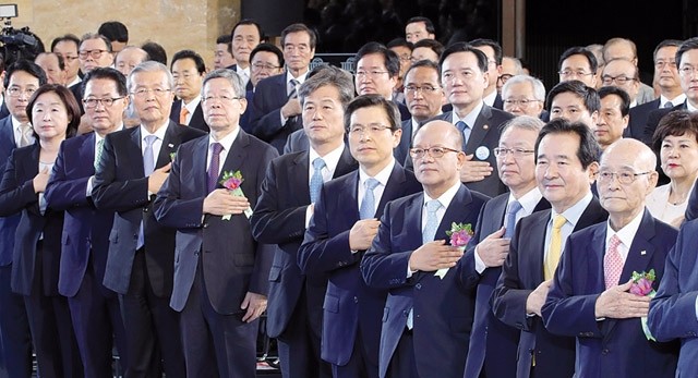 정세균 국회의장을 비롯한 5부 요인 및 당 대표들이 17일 오전 국회에서 열린 제68주년 제헌절 기념식에서 국기에 대한 경례를 하고 있다. 오른쪽부터 황한수 전 의원, 정 의장, 양승태 대법원장, 박한철 헌법재판소장, 황교안 국무총리, 이인복 중앙선거관리위원장, 새누리당 김희옥 혁신비대위원장, 더불어민주당 김종인 비상대책위원회 대표, 국민의당 박지원 비상대책위원장, 정의당 심상정 대표.