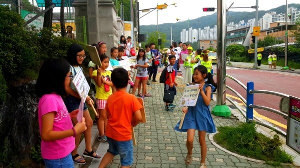 최근 경기 광주시 소재 양벌초등학교는 하굣길 교문 앞에서 어머니폴리스회와 학생들이 참석한 가운데 ‘친구들과 좋은 말 나누기’ 캠페인을 실시했다. 사진은 어린이들이 푯말을 들고 캠페인을 전개하고 있는 모습.(사진제공=양벌초등학교)