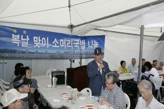 지난 16일 박홍섭 서울 마포구청장은 초복을 맞아 성산동 마포구장애인협회 사무실 앞마당에서 열린 '복날맞이 소머리국밥 나눔잔치' 행사에 참석했다. 사진은 박 구청장(가운데)이 인사말을 하고 있는 모습.(사진제공=마포구청)