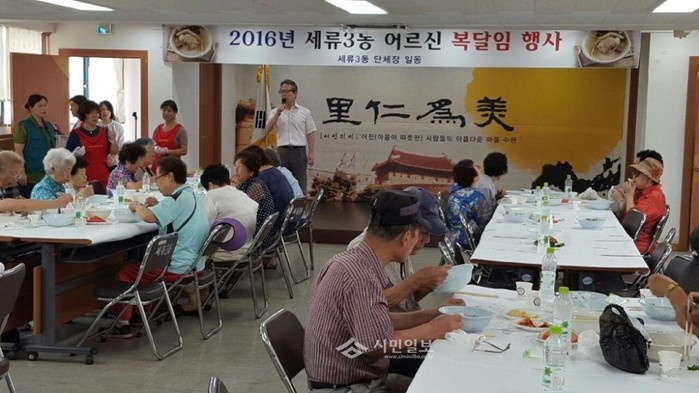 최근 경기 수원시 권선구 세류3동은 초복을 맞아 지역내 저소득 홀몸노인 50명을 초청해 '복달임 행사'를 개최했다. 사진은 행사에 참석한 노인들이 삼계탕을 먹는 모습.(사진제공=권선구청)