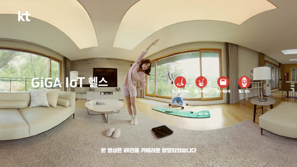 KT가 360도 VR 전용 카메라로 촬영한 영상 광고를 공중파 TV 등 다양한 매체를 통해 런칭했다고 밝혔다. KT는 이번 광고에서 배우 김지원이 ‘GiGA IoT 헬스’의 대표 상품인 골프퍼팅, 바이크, 체지방계 플러스를 사용하는 일상 모습을 VR 전용 카메라로 촬영해 광고에 전면 활용했다.