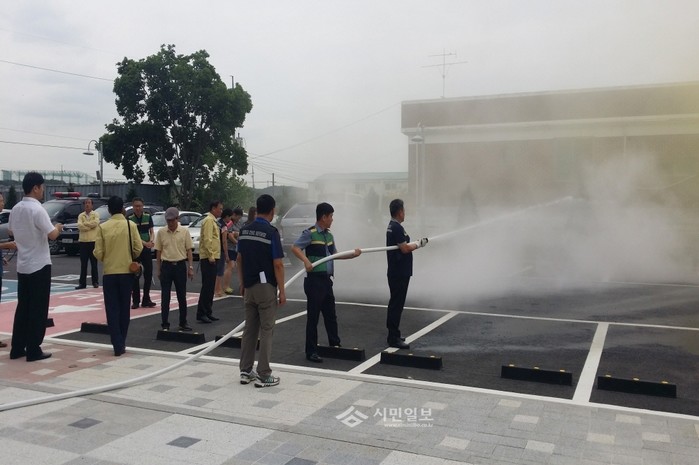 최근 경기 김포시 월곶면사무소는 전 직원이 참여한 가운데 월곶면 지역특성화 국지도발 대비 화재 대피훈련을 실시했다. 사진은 관계자들이 소방호스를 이용해 물을 뿌리는 모습.(사진제공=김포시청)